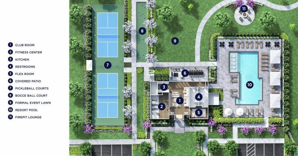 - Amenities: Clubhouse, Trails, Outdoor Pool, Pickleball Courts, Fitness Center, Bocce Courts